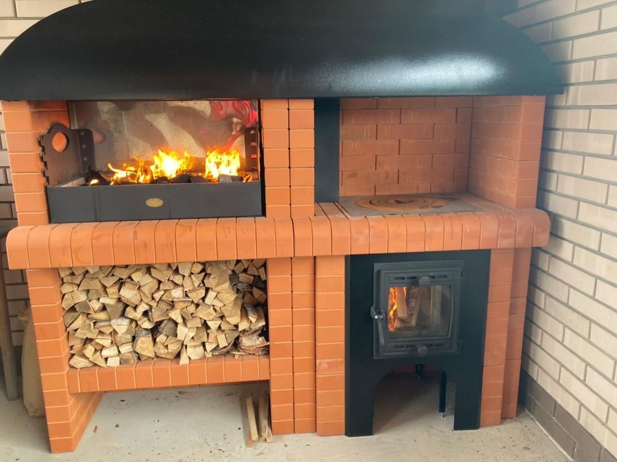 Во-первых, это конструкция: ещё нигде не применялась такая простая сборка кирпичных комплексов барбекю. Обычно все кирпичные элементы все «по старинке» соединяют с помощью раствора. Во-вторых, масса наших изделий позволяется устанавливать барбекю без фундамента. В-третьих, модульная конструкция может быть разобрана и перевезена на новое место жительства или изменено место расположение на участке. В-четвертых, несмотря на всю простоту конструкции наших барбекю, они ничем не уступают полноценным печным комплексам по тяге, пожаробезопасности и процессу приготовления пищи. Ну и ещё одна особенность – это топка печи под казан. Полностью шамотная подовая(без колосников и зольников) долго держит тепло, что позволит ставить горшочки прямо в топку как в русскую печь или спускать мясо на шампурах как в тандыре. Помимо этого, конструкция дверки и подача воздуха через неё устроены таким образом, что стекло всегда будет чистым(без копоти) и даст возможность наслаждаться эффектом камина.